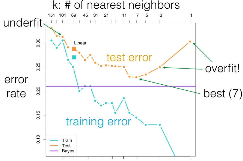 - 欠拟合:当验证/测试误差恶化时,原因是分类器不够灵活,无法拟合模式。