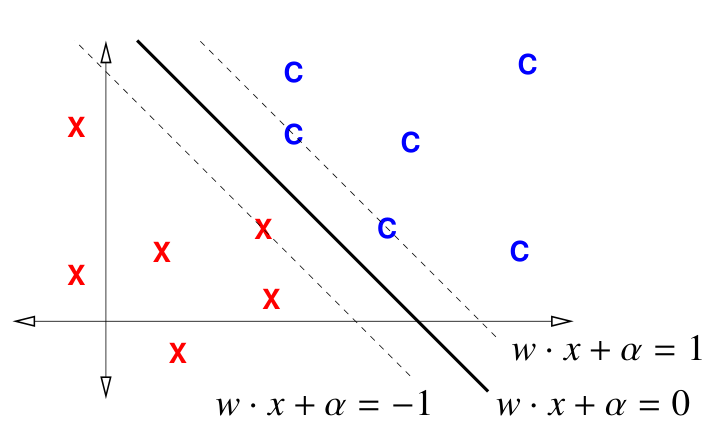 $$w \cdot X_i + \alpha \ge 1 \quad \text{for } i \in [1, n]$$由于标签 $y_i \in \{1, -1\}$,约束条件可以表示成