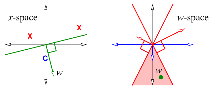 - 在 $x-$ 空间的样本点被转换为在 $w-$ 空间的超平面,这个超平面的法线为样本点