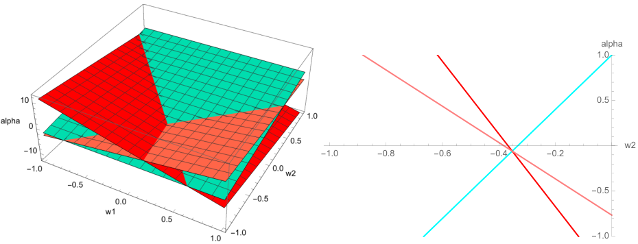 上图是 $(w_1, w_2, \alpha)$ 的三维空间。类别 $C$ 的样本点为法线的超平面为绿色,非类别 $C$ 的样本点为法线的超平面为红色。图中为 3 个样本点的情况。