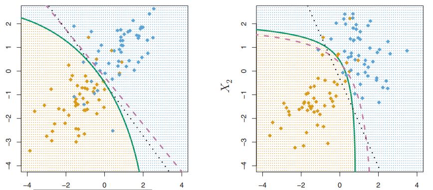 在上图中,贝叶斯决策边界是紫色的虚线,QDA决策边界是绿色的实线,LDA的决策边界是黑色的点线。当贝叶斯决策边界是线性的时,LDA可以得到更加稳定的拟合,而QDA可能过拟合;当贝叶斯决策边界是曲线时,QDA可能得到更好的拟合效果