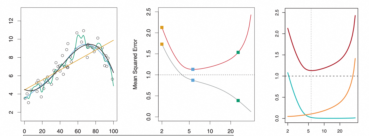左图中黑色线条为真实的函数,所有点在真实的分布上添加噪声采样而得,不同颜色的曲线分别是使用不同阶数拟合数据得到的曲线。中间灰色的曲线表示训练误差随模型阶数变化的曲线,红色的是测试误差随训练阶数变化的曲线。右边红色曲线是测试集上的平方误差(包含了偏差和方差)随结束变化的曲线,绿色的表示偏差,红色的表示方差