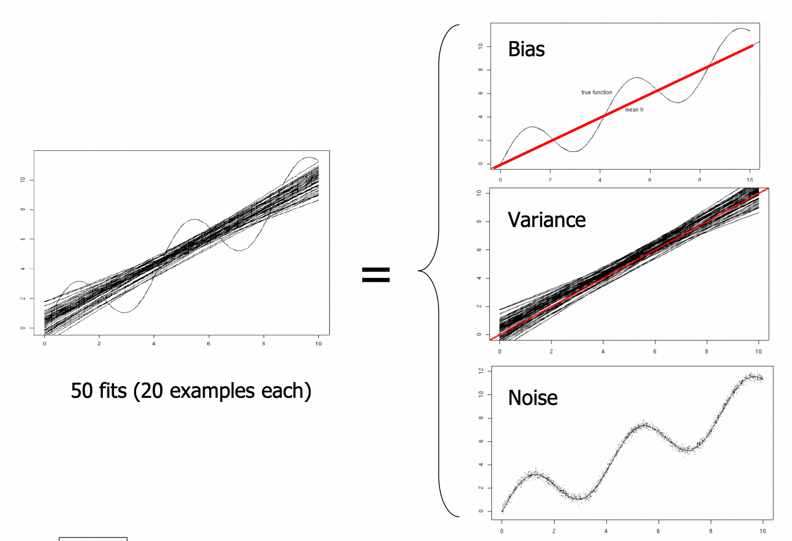上图中,左侧的 sine 曲线时实际函数 $g$,黑色直线是 50 条使用最小二乘线性回归拟合的结果 $h$,模型的风险可以分成右侧偏差、方差和噪声三个部分